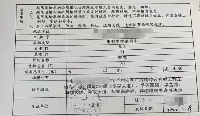 4月7日下午16時(shí),一部運(yùn)載水泥管的運(yùn)輸車輛途徑東孚超限運(yùn)輸檢測(cè)站,過(guò)磅顯示車貨總重53.65噸,同時(shí)該車還存在超高超寬的幾何超限行為。駕駛員拿出一張《福建省超限運(yùn)輸車輛通行證》,向執(zhí)法人員表示該車已辦理超限運(yùn)輸許可手續(xù)。