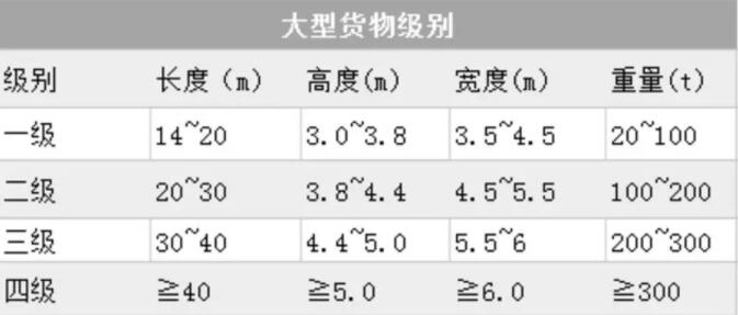 事實上,也不是隨便一個東西都能被稱為大件貨的,根據(jù)國家規(guī)定,長度在14米以上、寬度在3.5米以上、高度在3米以上的貨物,或是重量在20噸以上的單件及不可解體的成組(捆)貨物才能叫大件貨物。大件貨物又根據(jù)外形和尺寸重量分為四級,詳情如下圖所示: